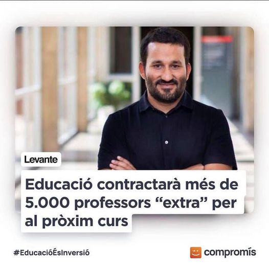 I eixa aposta pel sector públic no ha canviat. L’any passat, el curs escolar començava amb els dubtes de la comunitat educativa sobre com es podria dur endavant el curs. La ciutadania té clar que les nostres escoles i instituts van ser una arma fonamental per a aturar la pandèmia. I el curs 2021-22 reforçarà més eixa idea. El nostre conseller d’Educació, Vicent Marzà, anunciava que el nou curs començarà amb més de 5000 professors extres en els nostres centres (quasi 800 en les nostres comarques), hi haurà una aportació pressupostària de 39 milions d’euros per a reforçar la seguretat, s’assegurarà la presencialitat en tots els nivells i s’haurà vacunat a la totalitat del personal educatiu amb pauta completa i als majors de 12 anys amb almenys una dosi.
