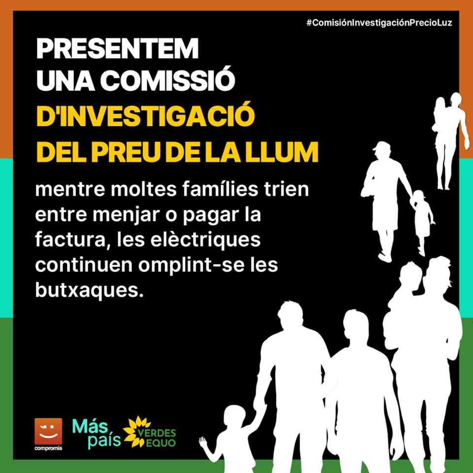 Des del Congrés, el nostre diputat Joan Baldoví ha anunciat una sol·licitud per a crear una comissió d’investigació que aclarisca els motius de la pujada del preu de la llum i que busque solucions reals per a un problema que el govern de Pedro Sànchez ha de solventar. Com va dir el nostre diputat, cal donar llum a un mercat molt fosc.