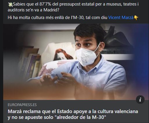 I ja de pas, Baldoví continua la seua lluita contra l’infrafinançament que les valencianes i els valencians patim per part de la ministra Montero, que es nega reiteradament a canviar el sistema de finançament que permet situacions surrealistes com les que coneixíem este mes d’agost: el 87’7% de la inversió en cultura es queda a Madrid. I això només en cultura! Que passarà si pensem en infraestructures com la xarxa de rodalies!
